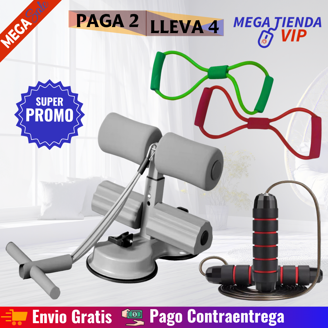 👉 El combo trae 3 elementos: ejercitador abdominal con ventosa de sujeción, banda elástica en figura 8 y cuerda para saltar profesional. Todo lo que necesitas para entrenar fuerza, abdomen y cardio en casa.