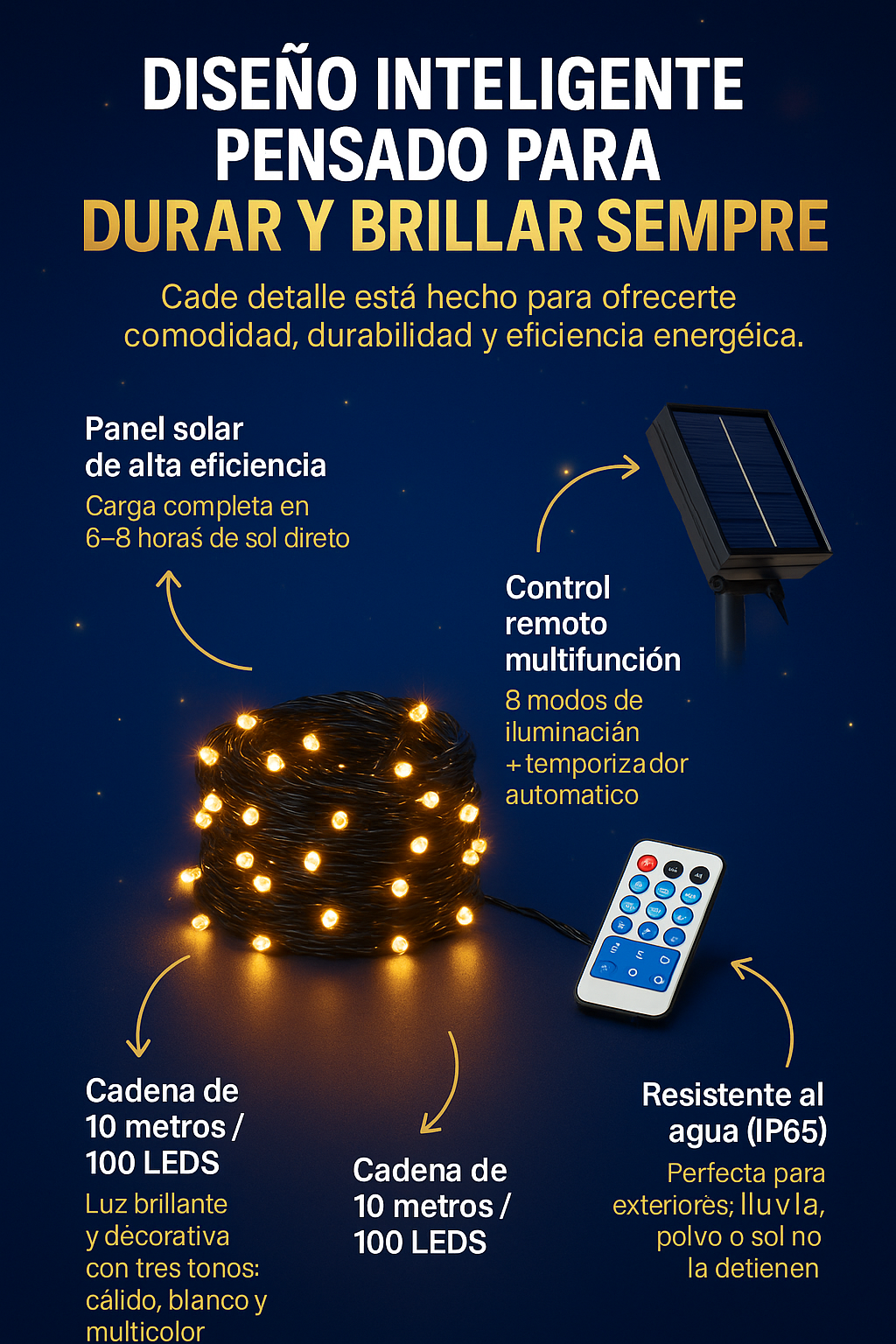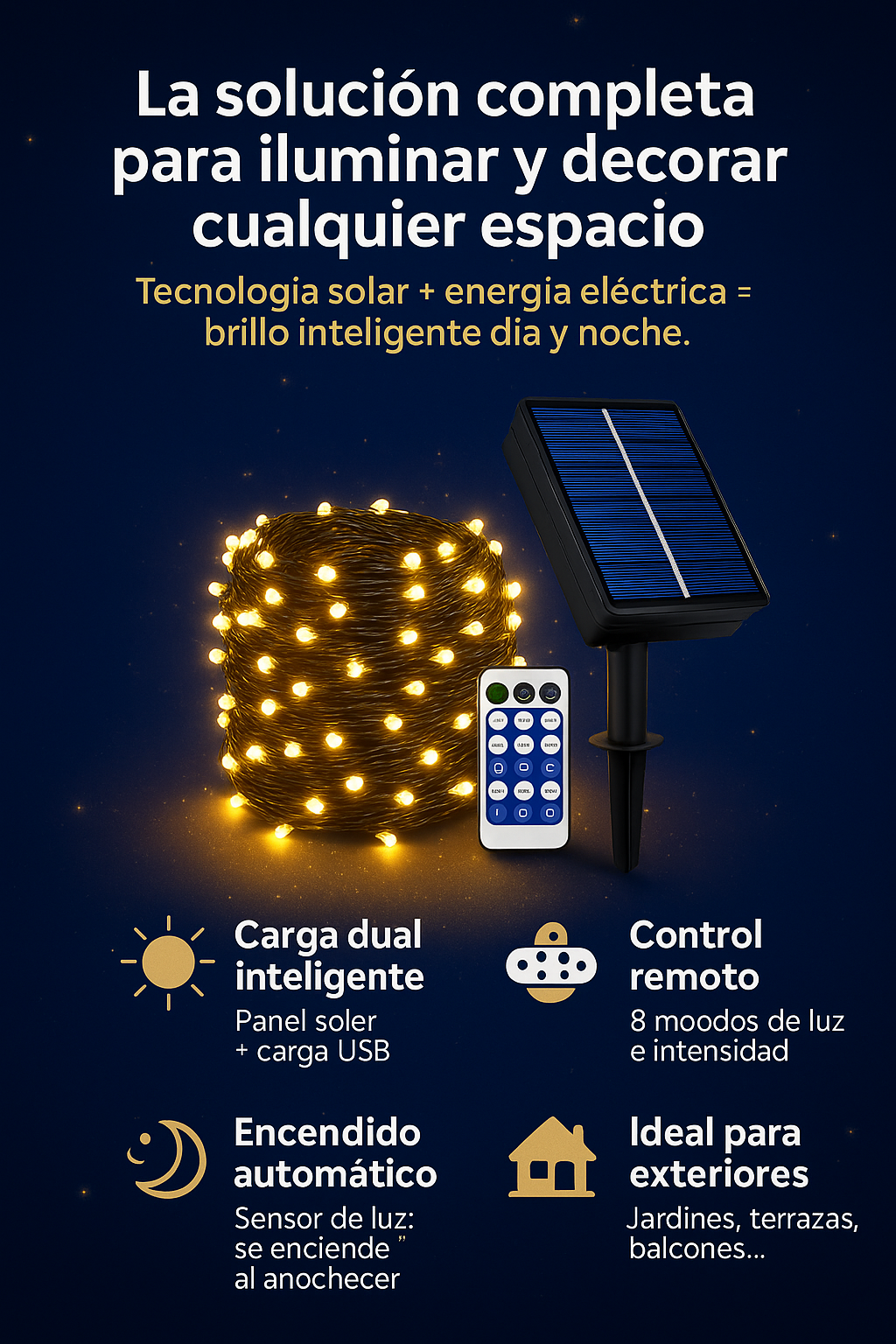 -Con energía solar, sensor de luz incorporado, se carga durante el día y se enciende automáticamente por la noche
