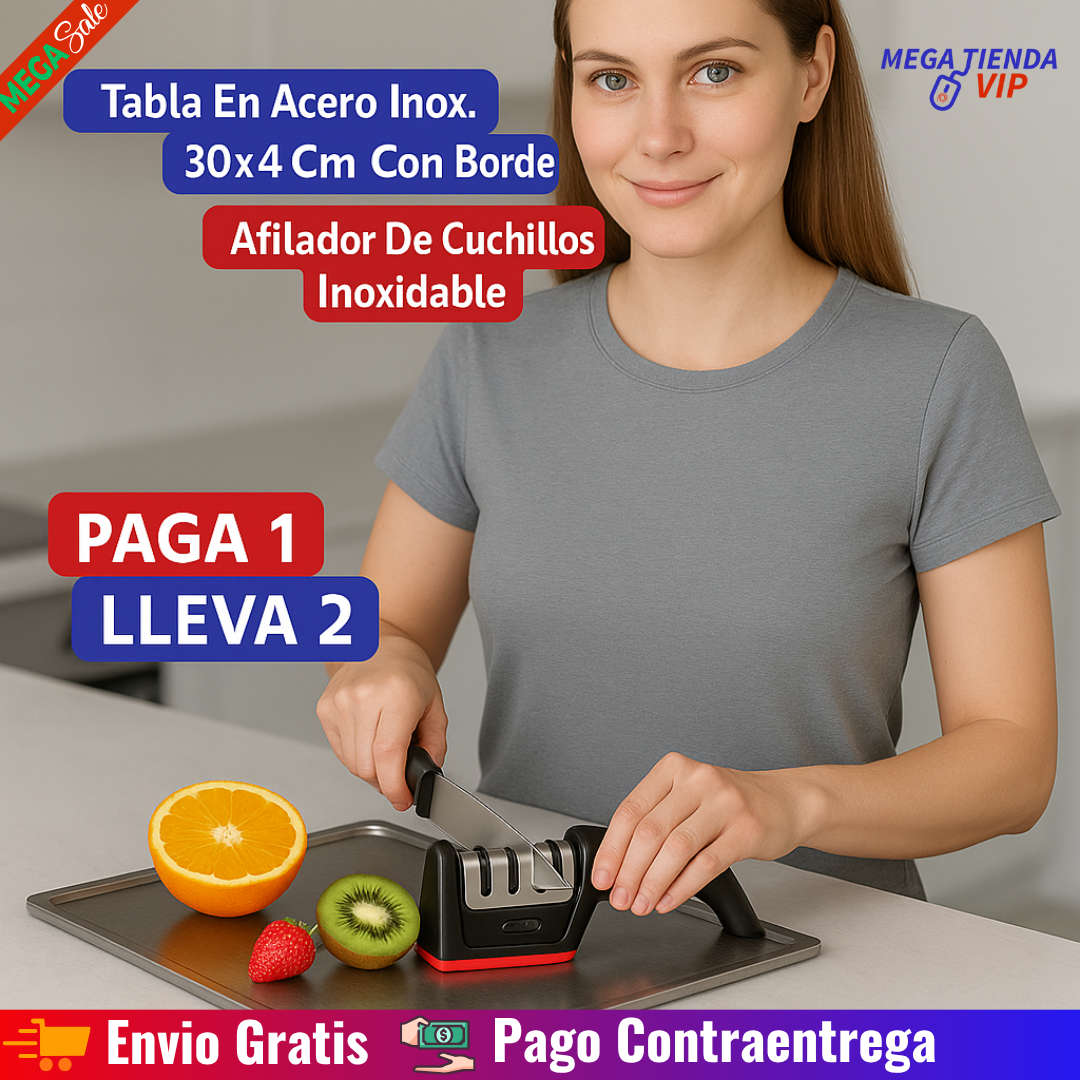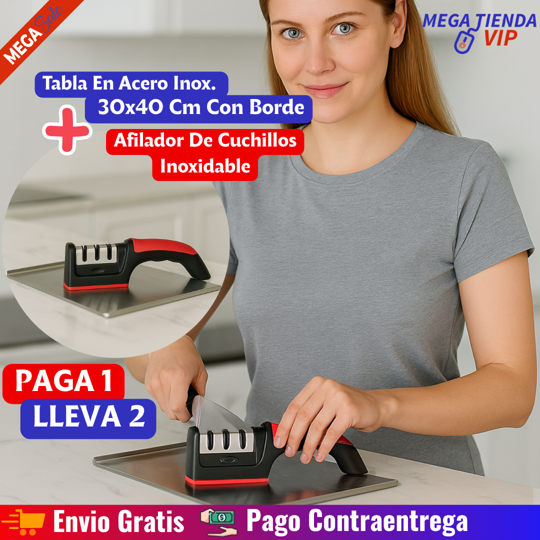 💬 El combo trae un Afilador de Cuchillos Inoxidable con revestimiento de diamante y base antideslizante, y una Tabla de Acero Inoxidable 30×40 cm con borde elevado.